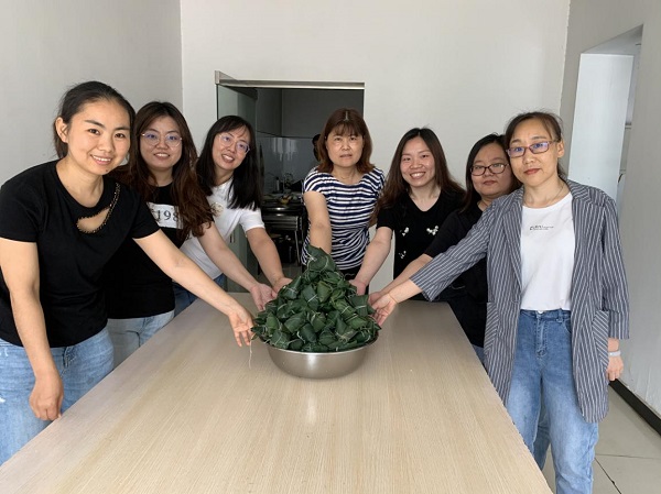 上午9點,粽葉、糯米、大棗整齊地擺上桌。大家邊包邊聊,其樂融融。在包粽子現(xiàn)場,熟悉包粽子的能手們飛快地拿起粽葉,兩手一窩卷成漏斗狀,填米、加棗、壓緊、扎繩,一氣呵成。她們還充當起“老師”的角色,教“新手”職工包粽子,手把手現(xiàn)場教學,“老師”教得仔細,“學生”學得認真,但要做出餡料十足、外觀漂亮的粽子還是需要費一番功夫的。隨著技巧的不斷嫻熟,一個多小時的時間,形狀各異、大小不一的一百多個粽子就堆積成山了,預算科副科長竇夢娜說:“我們包粽子的水平真是越來越高了,明年再包會更好!”此時每個人心里都洋溢著一股喜悅之情,有初學一門手藝的欣喜,有參與集體活動交流感情的滿足。