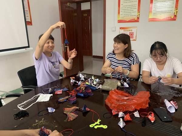在傳統(tǒng)習俗中,玲瓏可愛的各色香包也是端午節(jié)必不可少的元素。包完粽子后大家轉移陣地到了活動室,大家圍坐桌邊,面前堆放著一份份材料包,有棉布、艾草、針線、中國結流蘇。面對這個從來沒有做過的DIY,大家開始研究起來,有的用手機搜索縫制方法流程,有的直接比來比去親自摸索著縫起來。有職工說:“這有點像咱們小時候老人們縫的毽子,那個里面裝的是五谷雜糧,咱們現(xiàn)在裝的是艾草。”“這香囊可以掛在辦公室或者車上,有清香、驅蚊的功效。”“我算是知道了,這個流蘇應該縫在這個邊的中間,而不是角上……”大家你一句我一句,手中的針線穿梭在棉布間,用密密的針腳縫制出傳統(tǒng)佳節(jié)最好的注解,用絲絲線線纏繞出端午安康的美滿寓意,一個個精巧可愛的三角香囊在大家的努力下完美呈現(xiàn)。