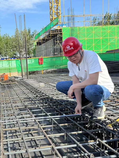 在搶抓進度的同時,史驚濤深知質量是項目的生命線。他帶領團隊狠抓質量控制,實現過程精品、一次成優(yōu),定期召開“質量分析會+作業(yè)面交底會”,嚴控每一個環(huán)節(jié)、精研每一道工序,尤其是在地下室施工鋼筋綁扎階段,鋼筋間距密、數量多,柱插筋、集水坑鋼筋要求位置精確,施工難度較大,他認真分析質量控制重點和難點,進行專項攻關,結合現場實際情況反復推敲施工方案,按照圖紙設計間距,在基礎墊層上彈好鋼筋位置線,綁扎時嚴格按照位置線進行柱插筋及集水坑鋼筋的放置及綁扎,墻筋采用水平和豎向定位筋,確保綁扎牢固,間距均勻,縱橫成線。