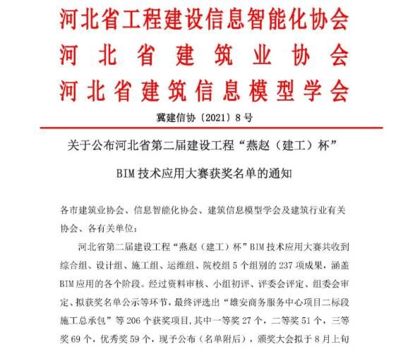 7月14日,河北省第二屆建設(shè)工程“燕趙(建工)杯”BIM技術(shù)應(yīng)用大賽獲獎(jiǎng)名單揭曉,公司參賽的7項(xiàng)成果全部獲獎(jiǎng),其中一等獎(jiǎng)2項(xiàng)、二等獎(jiǎng)2項(xiàng)、三等獎(jiǎng)3項(xiàng)。