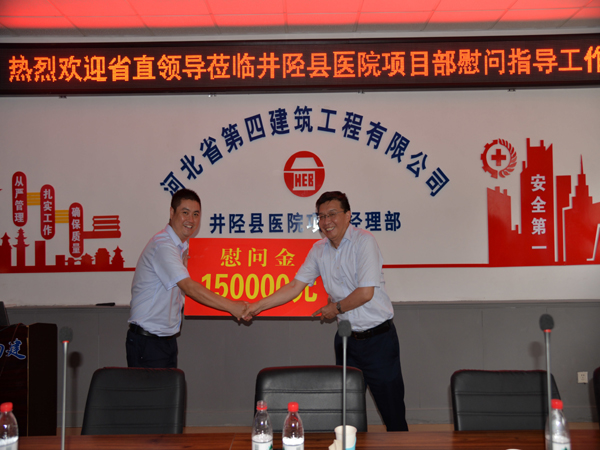 7月26日下午,河北省直工委副書記范金龍一行到二分公司井陘縣醫(yī)院項(xiàng)目部,對(duì)奮戰(zhàn)在一線的職工進(jìn)行暑期慰問(wèn),為他們送來(lái)了慰問(wèn)金和慰問(wèn)品。集團(tuán)工會(huì)主席王文利、公司黨委副書記、紀(jì)委書記、工會(huì)主席李懷生、二分公司黨總支書記孫立鋒一同參加。