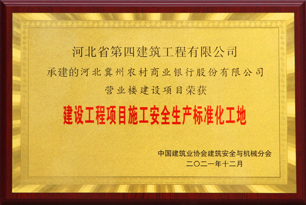 2021年12月22日,公司收到中國建筑業(yè)協(xié)會安全與機(jī)械分會下發(fā)的文件,我公司施工的河北冀州農(nóng)村商業(yè)銀行股份有限公司營業(yè)樓建設(shè)項(xiàng)目喜獲全國安全生產(chǎn)標(biāo)準(zhǔn)化工地,這是公司第9次獲得此項(xiàng)榮譽(yù)。