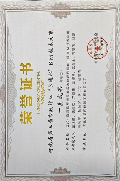 8月16日,七分公司收到了河北省市政行業(yè)協(xié)會(huì)頒發(fā)的榮譽(yù)證書(shū)。分公司參賽的“G104海河路至柳孟春段改建項(xiàng)目配套工程BIM技術(shù)應(yīng)用”成果,在河北省第三屆市政行業(yè)“永通杯”BIM應(yīng)用技能大賽中被評(píng)為一類成果。