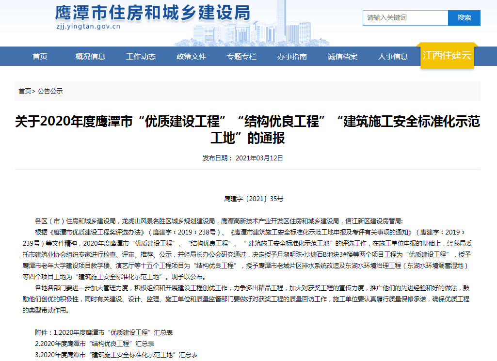 4月12日,從江西省鷹潭市住房和城鄉(xiāng)建設(shè)局網(wǎng)站獲悉,四分公司承建的鷹潭市檔案中心項目喜獲2020年度鷹潭市結(jié)構(gòu)優(yōu)良工程和建筑施工安全標(biāo)準(zhǔn)化示范工地兩項榮譽(yù)。