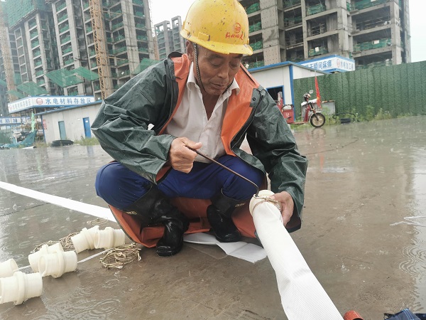 針對(duì)因強(qiáng)降雨導(dǎo)致項(xiàng)目部分地區(qū)已出現(xiàn)的積水,項(xiàng)目部立即組織人員在不同房號(hào)、洞口分別用10余臺(tái)潛水泵進(jìn)行抽水,做到“隨下隨排”,避免因積水問題影響項(xiàng)目進(jìn)度。