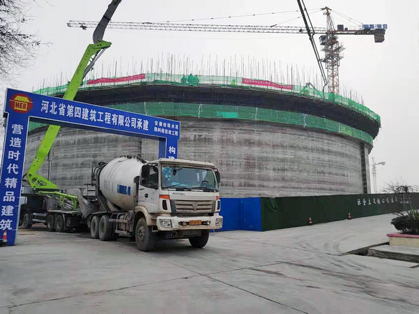 熟料儲存及輸送筒倉直徑60米,高20.5米。1月11日,業(yè)主項目負責(zé)人王利杰組織召開專題會議,鄭重要求1月20日前滑模施工必須完成。面對業(yè)主早日投產(chǎn)的殷切期盼,項目部緊急組織施工策劃,明確搶進度措施辦法,全體動員,多點發(fā)力,全力以赴保滑模施工。在動員會上,成立了以項目經(jīng)理為組長的滑模領(lǐng)導(dǎo)小組,班子帶班,明確責(zé)任目標(biāo);與作業(yè)班組簽訂安全、質(zhì)量承諾書,增強其責(zé)任意識;購置鋼筋間距測量設(shè)備,節(jié)省驗收鋼筋工程時間和人力。由于疫情原因,現(xiàn)場勞力不能迅速到位,項目部提前組織管理人員晚上加班吊運鋼筋、水泥、腳手板等材料,大家高漲的干勁兒在滑模現(xiàn)場起到了積極的帶動作用。庫壁預(yù)應(yīng)力鋼絞線設(shè)置較為密集,每間隔26厘米一道,而且?guī)в腥嵝裕鶐毂阡摻顑?nèi)穿設(shè)時容易跑偏,工作效率低。為加快施工,技術(shù)人員巧妙地在庫壁鋼筋上加設(shè)了U型鋼筋固定鋼絞線穿行位置,然后大家一字排開,“一二、一二……”齊聲喊著口號,有節(jié)奏地用力將鋼絞線在庫壁鋼筋里穿行直到扶壁柱。數(shù)九隆冬的夜間滑模平臺上氣溫很低,但是大家的工作熱情不減,干勁不退,抬鋼筋、綁鋼筋、穿鋼絞線……,干得熱火朝天,沒有人叫苦喊累,在大家的共同努力下,滑模以每天2.7米的速度快速推進。