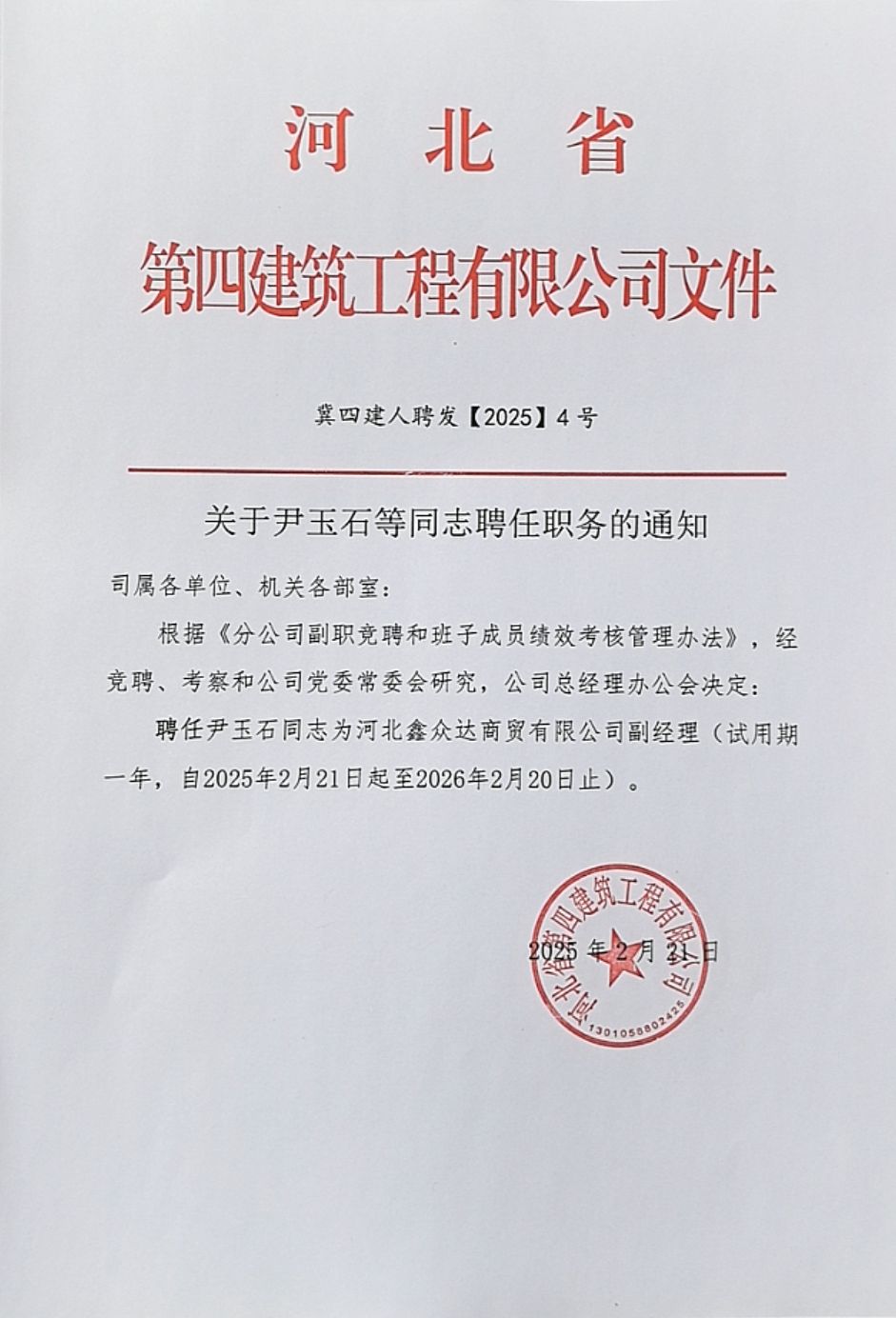 關(guān)于尹玉石同志聘任職務(wù)的通知